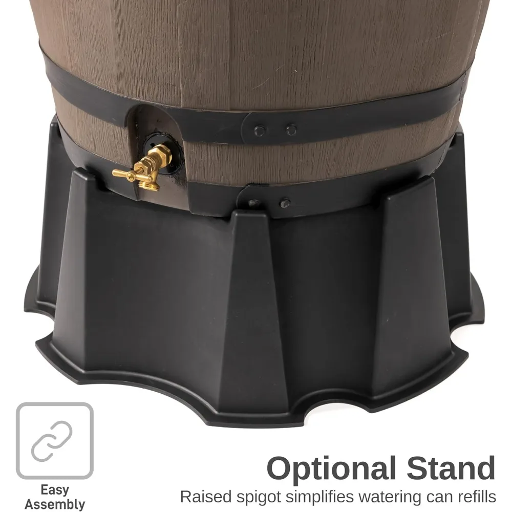 • 55-Gallon Capacity: Ideal for collecting and storing rainwater for watering gardens, lawns, and outdoor plants. • Woodgrain with Black Stripes Color: Adds a natural, rustic look with stylish black stripes, complementing outdoor décor. Flat back shape allows the rain bel to fit snugly against walls or fences, perfect for tight spaces. • Removable Lid: Provides easy access for cleaning and water retrieval, making hassle-free. • Overflow System: Safely redirects excess water to prevent overflow and potential water damage. • Premium Brass Spigot: Features a high-quality brass spigot for easy, secure, and leak-free water retrieval. • Optional 55 gallon rain bel stand sold separately. • Made in the USA.