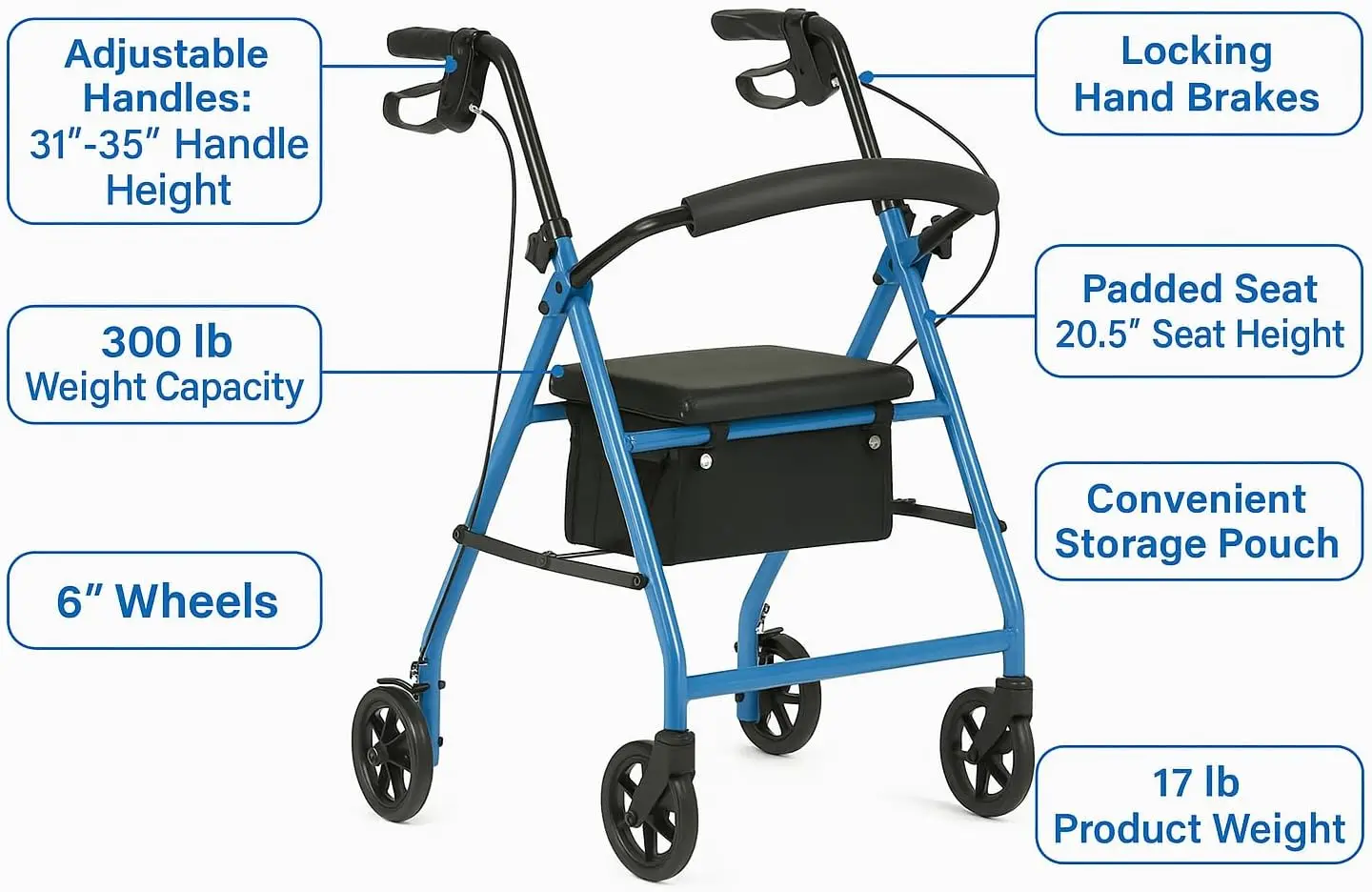 Sturdy Support with 300 lb Capacity – Durable steel frame supports up to 300 lbs, making this rollator walker a reliable mobility solution for daily use. Smooth 6” Wheels for Indoor & Outdoor Use – Non-marking 6-inch wheels glide easily across surfaces, providing smooth movement both indoors and outdoors. Adjustable Handles for Customized Comfort – Ergonomic handles adjust from 31” to 35” in height, ensuring the perfect fit for users of varying heights. Built-In Padded Seat with 20.5” Height – Need a break on the go? Rest comfortably on the integrated padded seat with supportive backrest for added stability. Locking Hand Brakes for Extra Safety – Easy-to-use loop hand brakes provide controlled stops and lock securely for stability while seated.