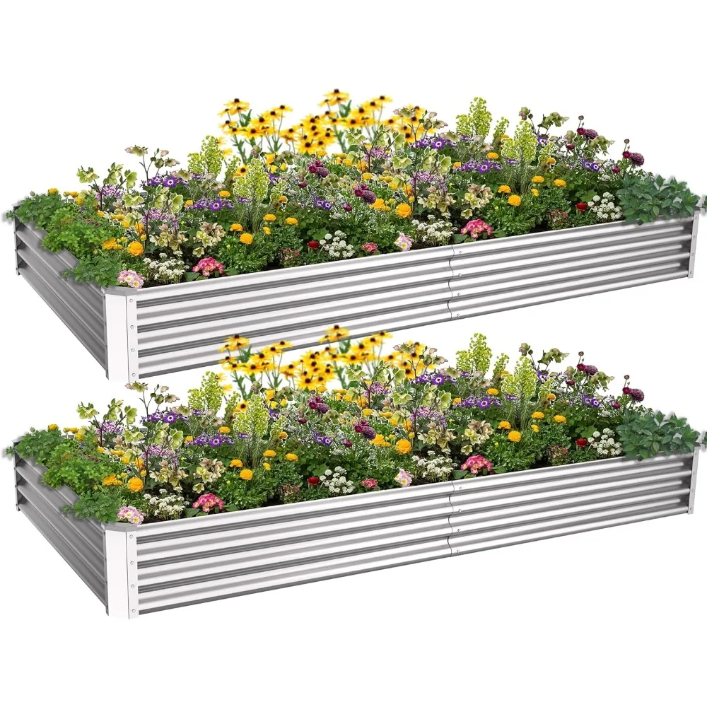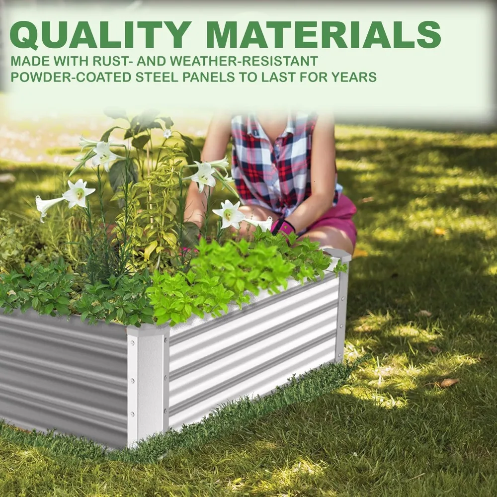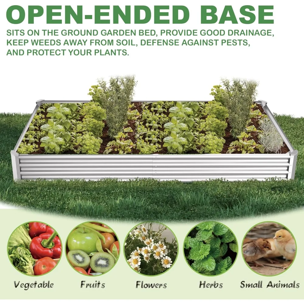 BEGIN YOUR GARDEN JOURNEY: 8x4x1ft raised beds for gardening! Anti-rust process and durable structure build a ideal environment for vegetables or plants. 3 colors allow you to choose from, silver, grass green, dark gray, to meet your garden color scheme. OPPEN BASE DESIGN: which effectively protects plant roots by preventing excess water from accumulating. Due to the 12 inches deep, it's suitable for growing deep-rooted plants. There's plenty of room to grow larger crops of vegetables or plants. Also it can be moved in any places you like. EFFORTLESS 5-MINUTE ASSEMBLY: Interlocking panels snap together securely – simply unfold, connect, and fill with soil. Perfect for DIY beginners and busy gardeners. SAFETY C0VER & SUPP0RT C0NNECTING ROD: We provide 4 plastic cap at each corner, which can protect you from injuring and 3 integrated connecting rod structures support the entire garden bed not easily deformed. INDUSTRIAL-GRADE DURABILITY: galvanized steel with anti-corrosion coating, this metal raised bed withstands extreme weather, resists rust for 5+ years, and outperforms wooden beds in longevity.
